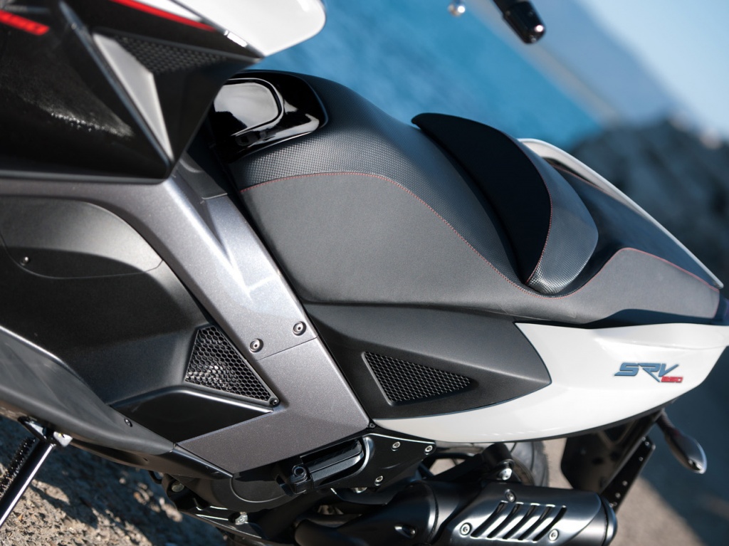 Комплектация Aprilia SRV 850 ABS оснащена вариаторной коробкой передач, 0.8 литровым двигателем (76 л.с.). Стоимость данного скутера составляет 900 000 руб.